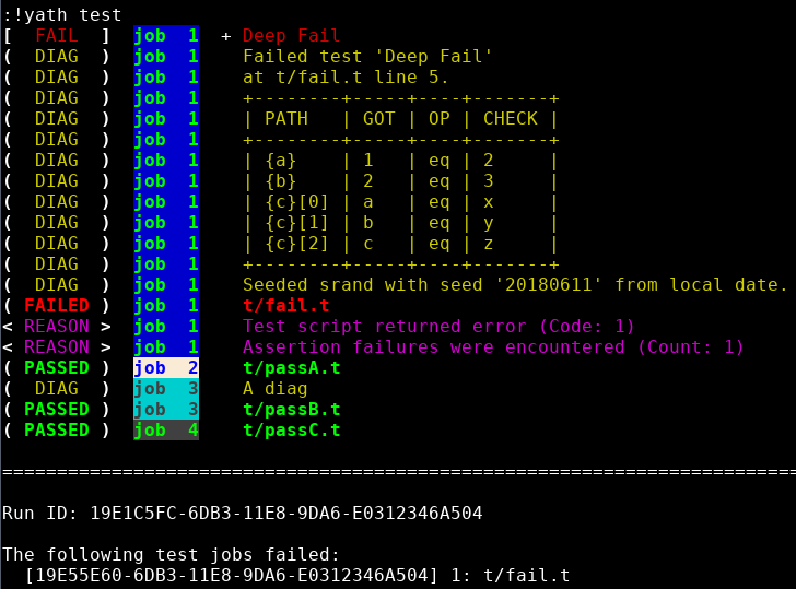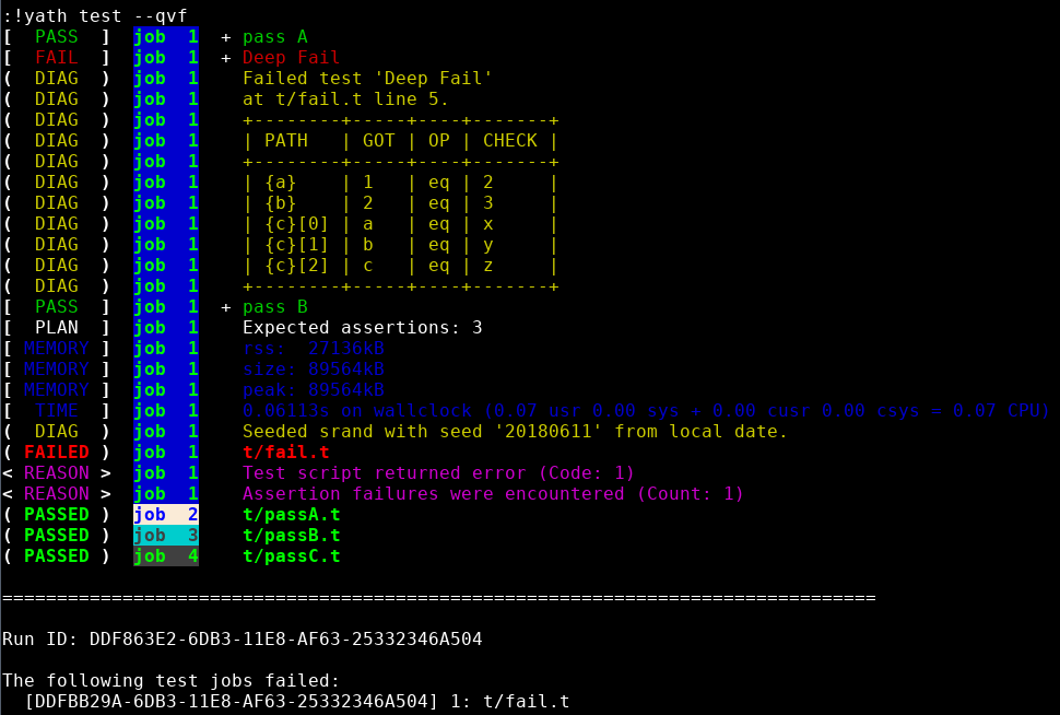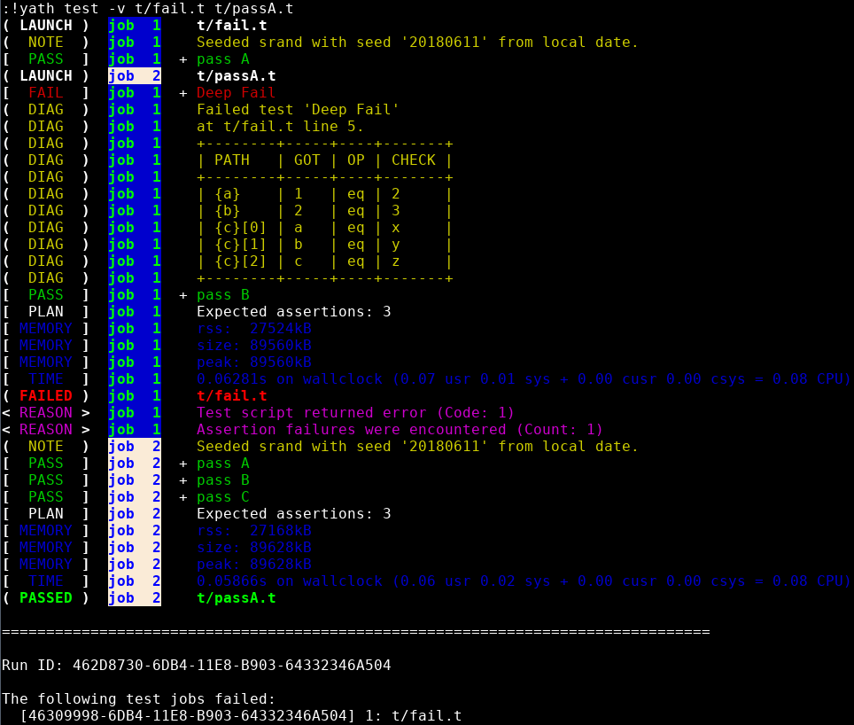 The rules are similar to prove's, passing test gets one line, diagnostics messages and failed tests are still printed.